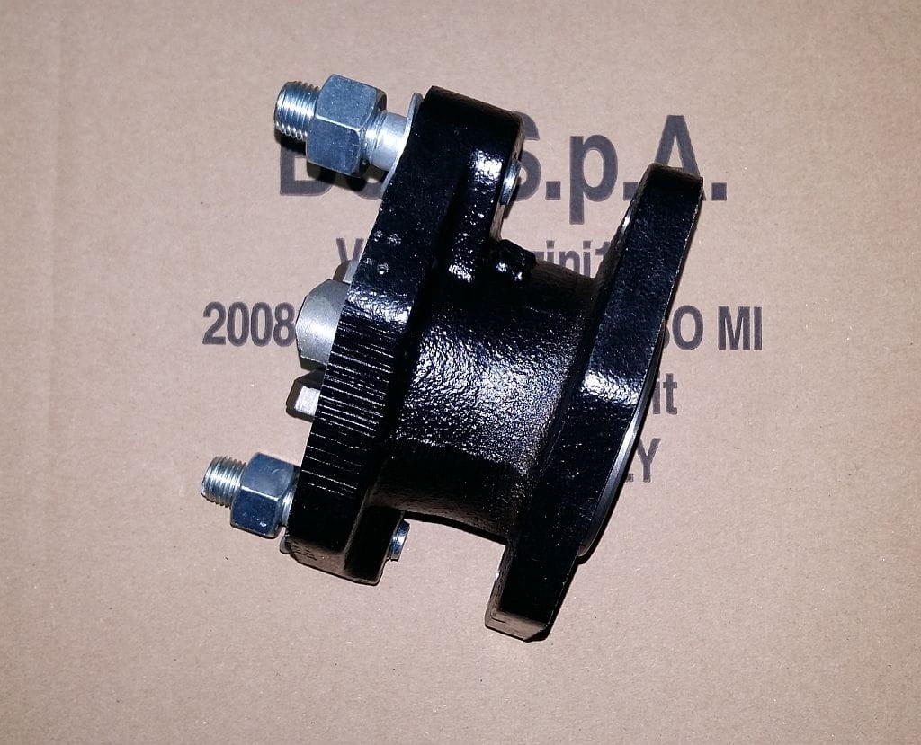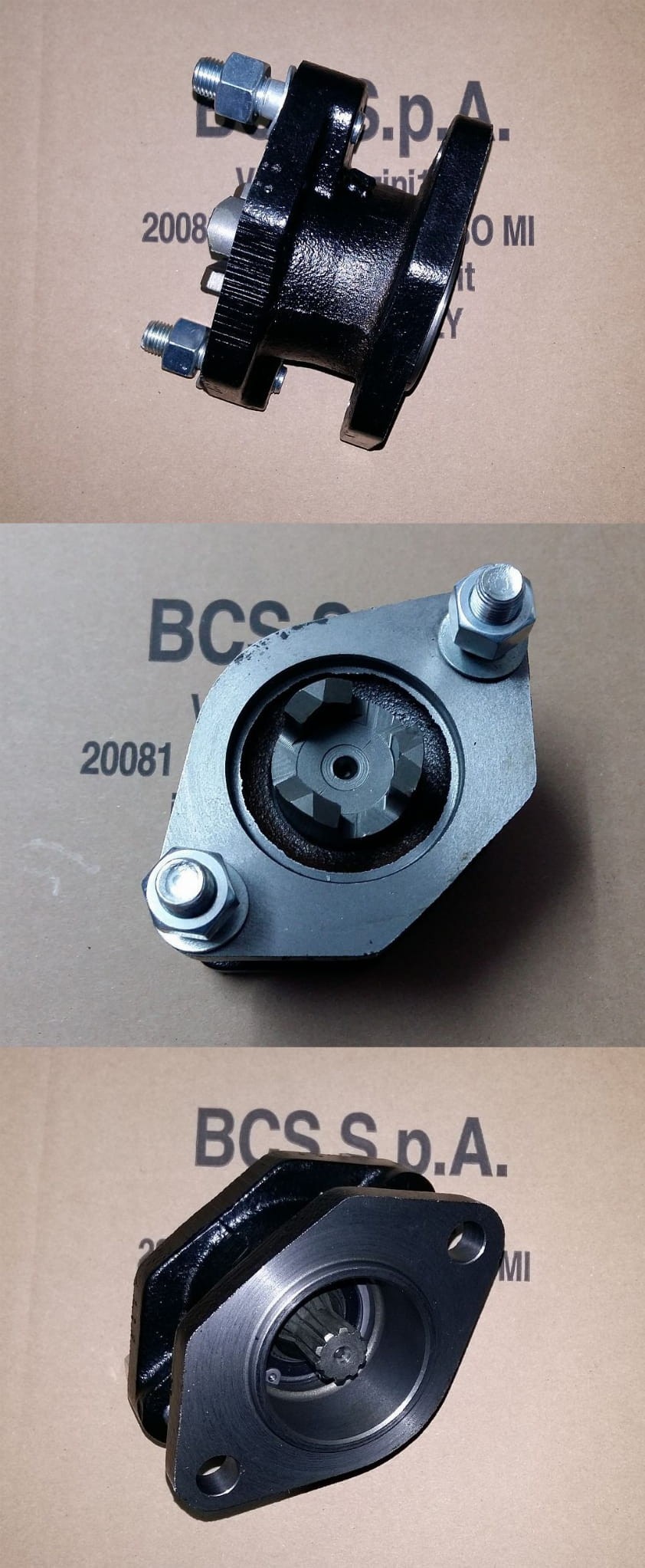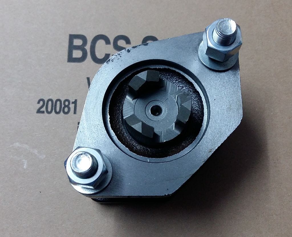Adapter służący do podłączenia maszyn posiadających końcówkę wyjścia WOM w nowym standardzie BCS (trójząb) do ciągników BCS posiadających wyjście WOM w starym standardzie (wielowypust).