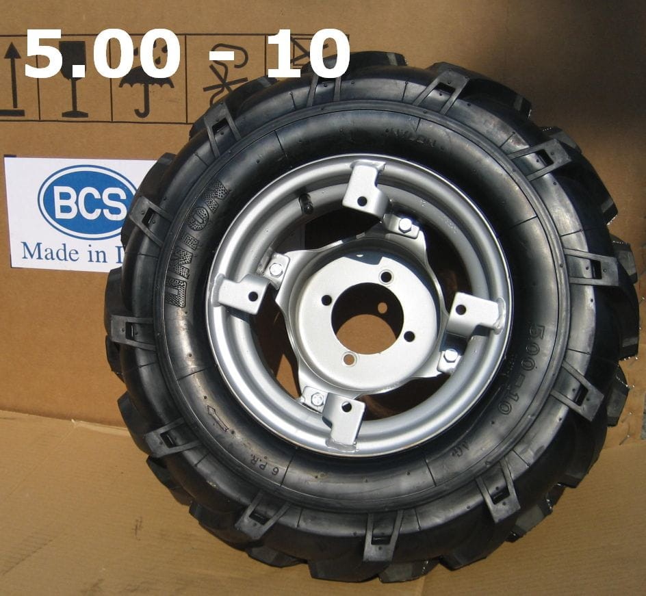 Koła kompletne do ciągników jednoosiowych BCS. Koło składa się z obręczy, tarczy mocującej, opony oraz dętki.