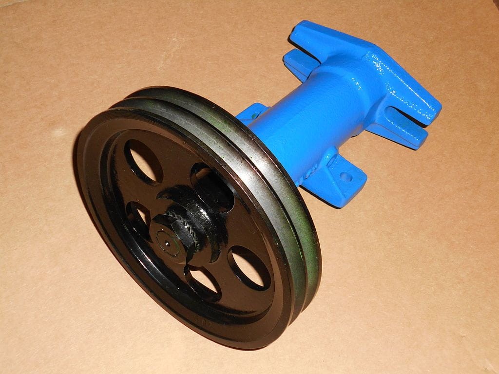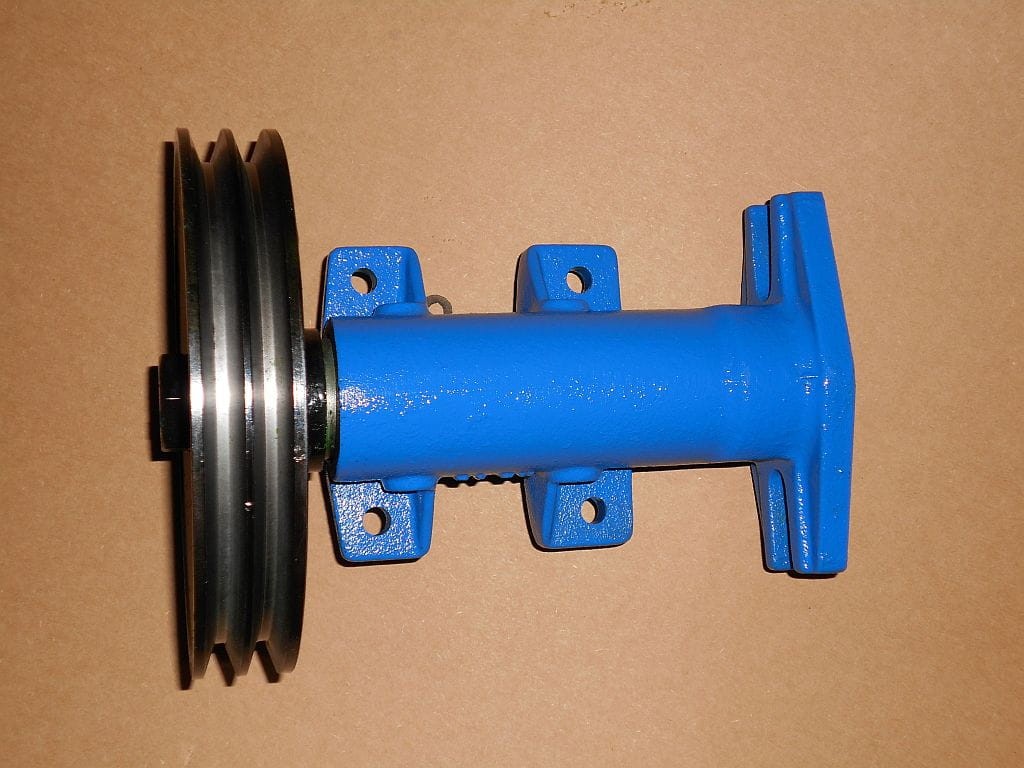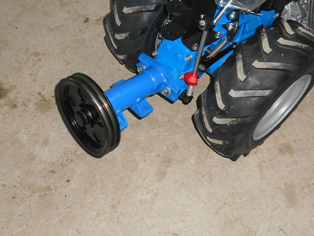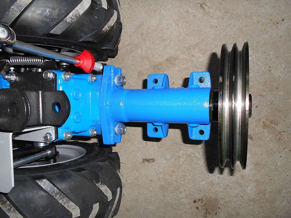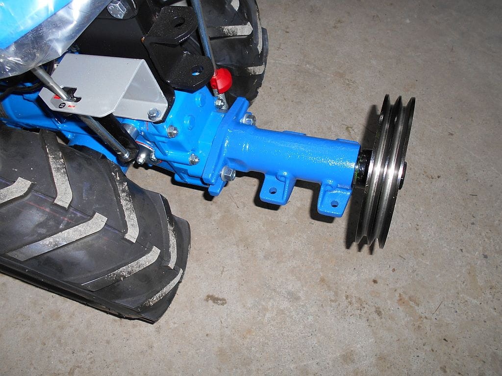 Przedłużacz z zamontowanym kołem pasowym na dwa paski klinowe. Adapter umożliwia przekazanie mocy z ciągnika jednoosiowego na dowolną inną maszynę za pomocą przekładni pasowej.