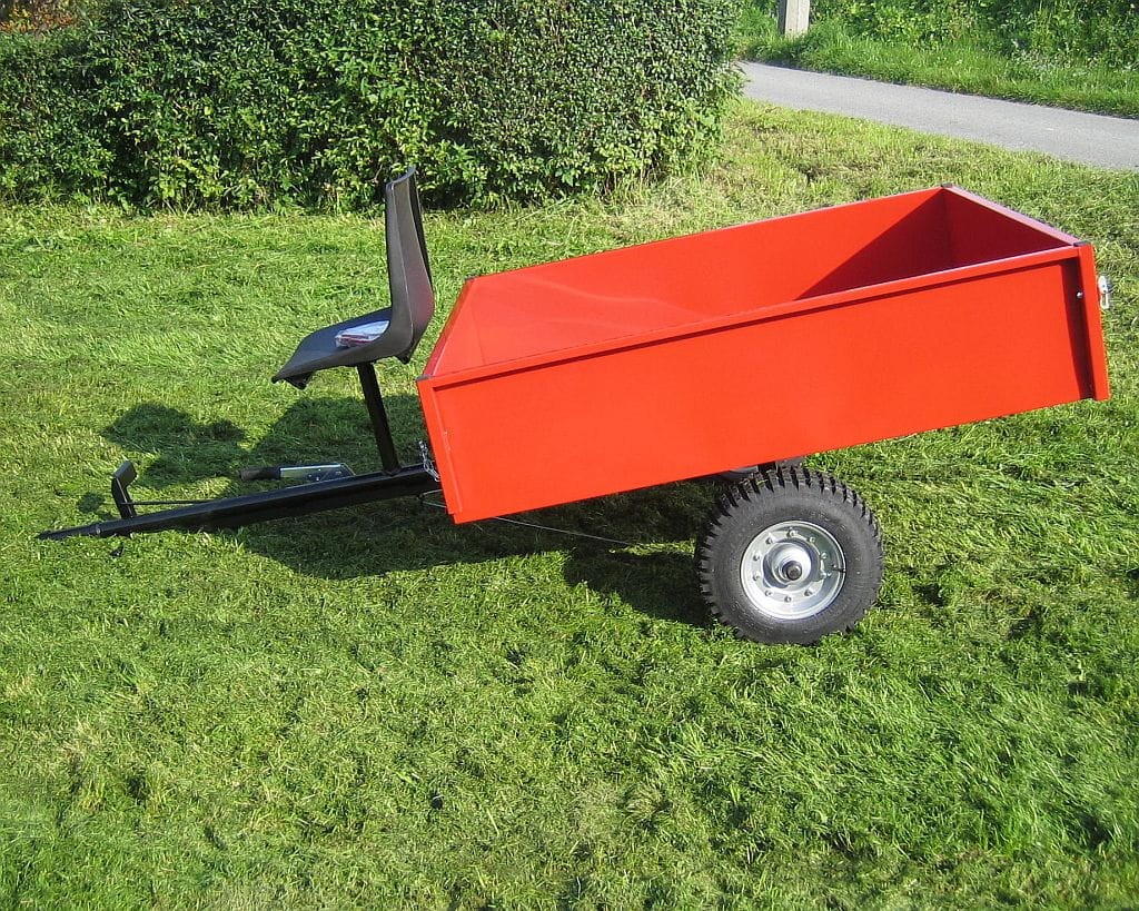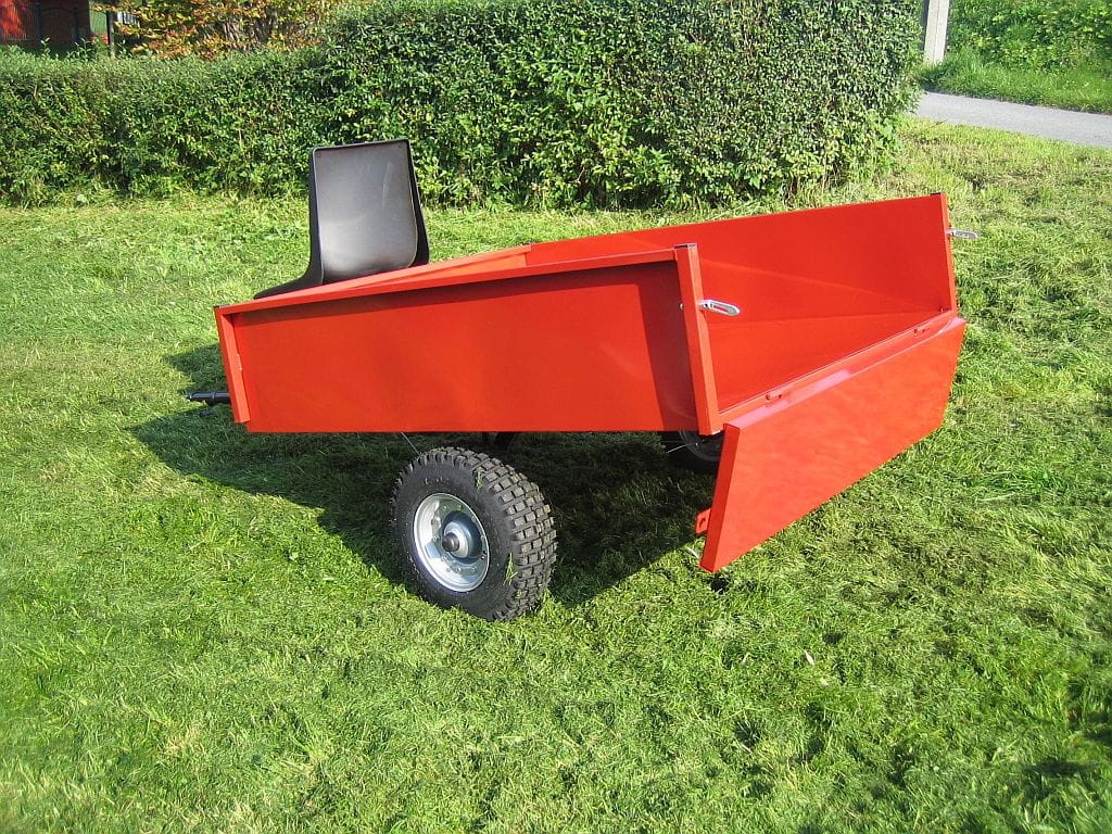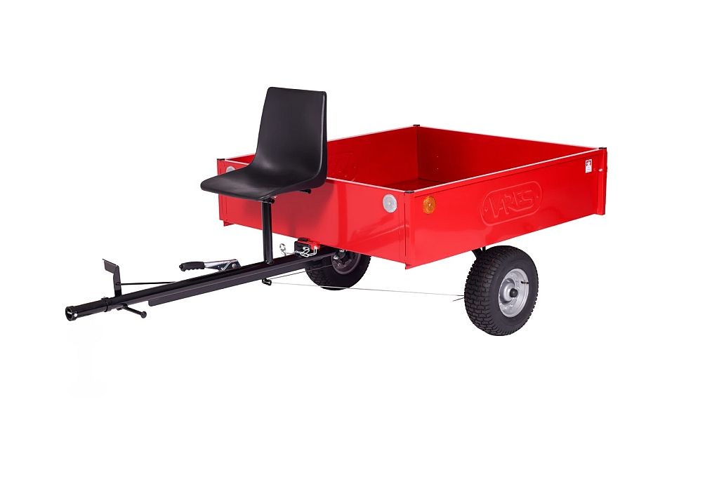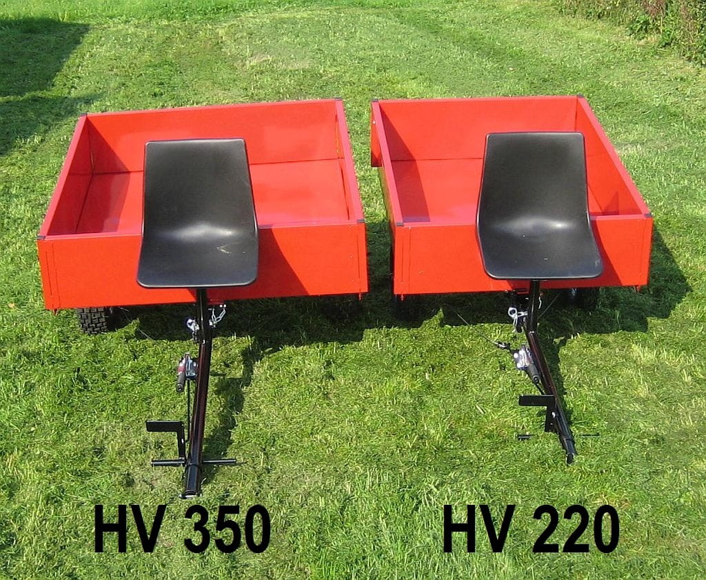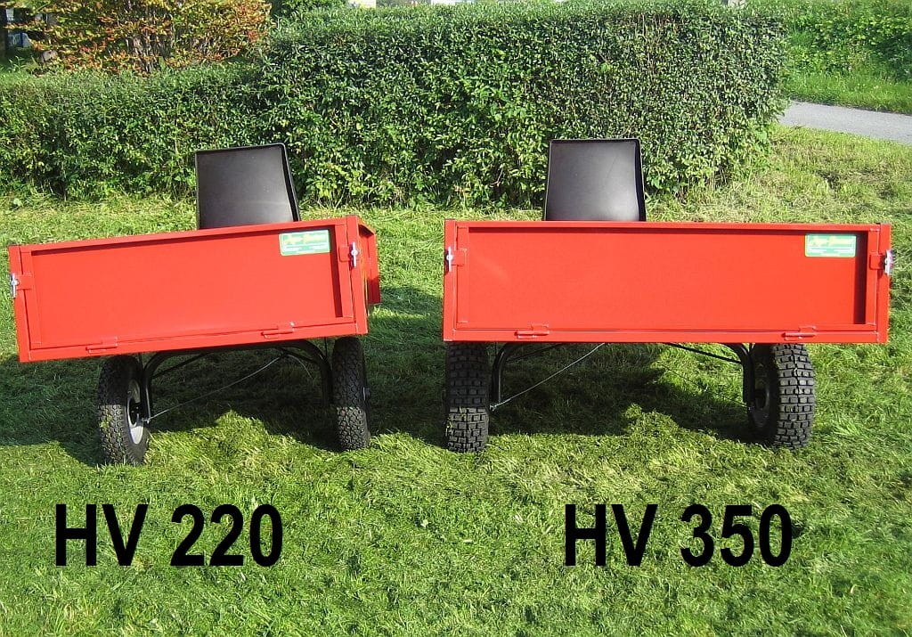 Model HV350. Ładowność 350 kg. Wymiary skrzyni 140x121x30 cm. Koła 16x6.50-8". Siedzisko dla operatora, hamulec postojowy i wywrot do tyłu.